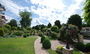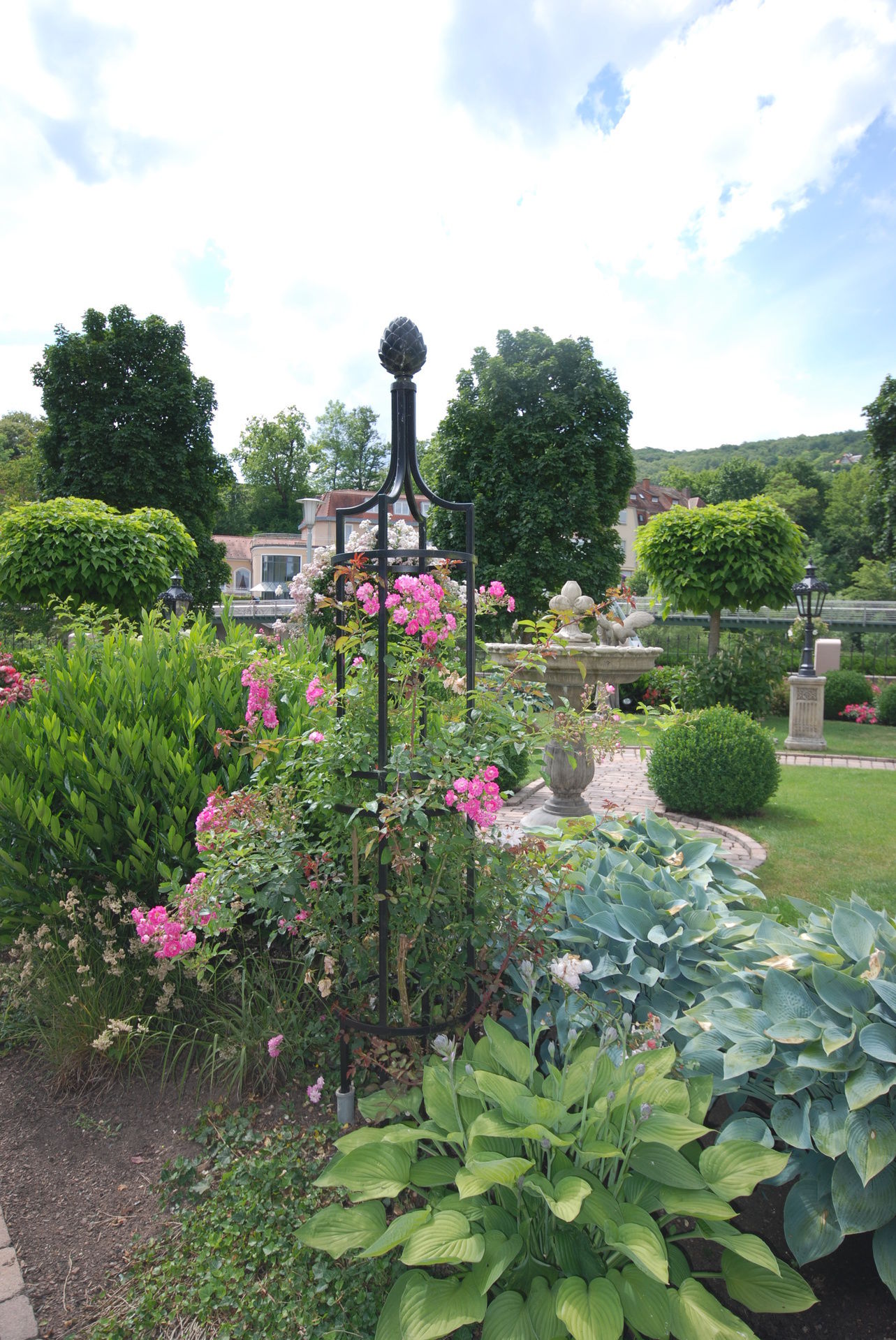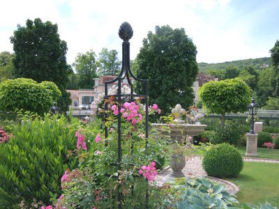 Beide Häuser befinden sich in einem gepflegten Garten mit alten Steinfiguren, idyllischen Rosenlauben und einigen Springbrunnen.